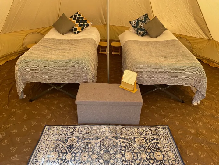 Up to 3 nights of bell tent rental including soft flooring, rug, door mat, 2 single camp beds with 100 mm foam mattress, 2 bedside tables, 2 single bedding sets with scatter cushions, pole light, ottoman, small mirror and luxury throws. (exact colour scheme may vary) 5m (sleeps 2 with room for 2 additional single camp beds, see below):